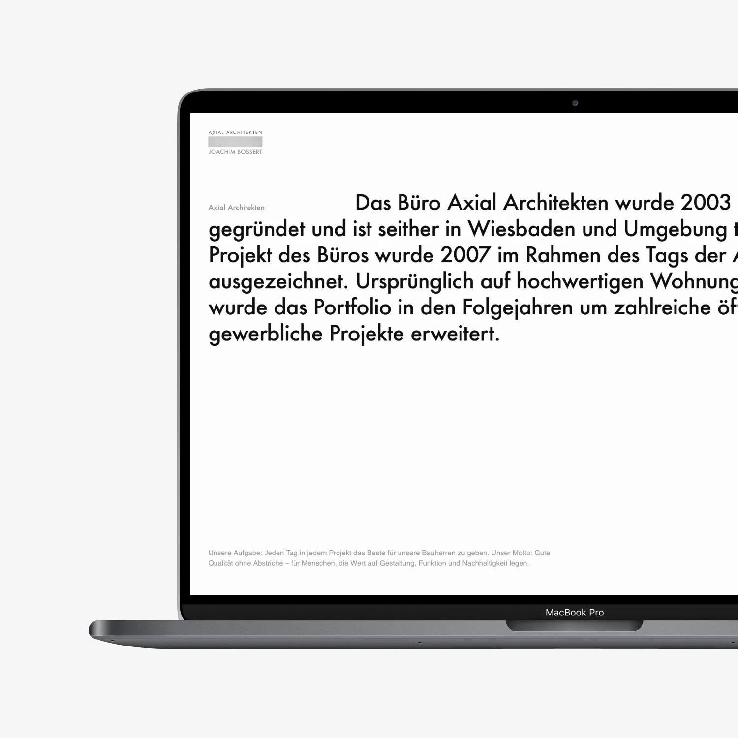 Axial Architekten Im Rahmen des Re-Brandings lag der Fokus auf der Entwicklung einer visuellen, reduzierten Website, die die Projekte von Axial Architekten in den Mittelpunkt stellt und zugleich die Identität des Büros klar vermittelt.